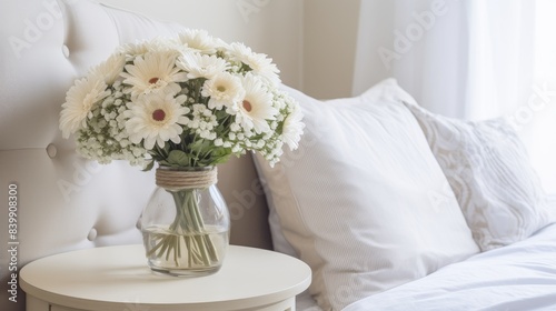design, interior, bedding, room, home, white, bedchamber, pillow, apartment, furniture, vase, lamp, modern, comfort, cushion, flower, relaxation, green, luxury, decor, wooden, rest, sleep, lifestyle, wall, table, house, morning, nobody, natural, hotel, clean, blanket, bedside, bright, living, soft, linen, flat, bouquet, plant, suite, retro, style, residential, background, bedclothes, pastel, domestic