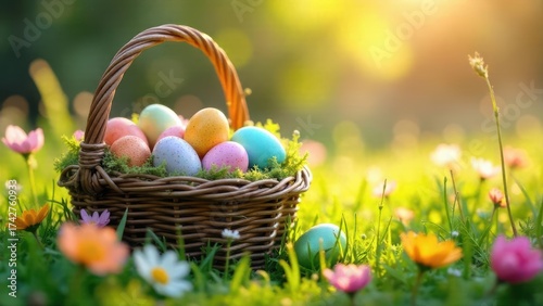 basket, egg, pastel, spring, meadow, flower, sunlight, vibrant, colourful, holiday, celebration, easter, nature, festive, joyful, happiness, springtime, cheerful, decoration, season, beautiful