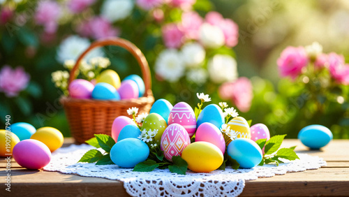 A wicker basket overflows with colorful Easter eggs on a table amidst blooming pink roses.
