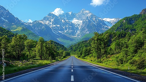 wide, highway, verdant, mountain, clear, blue, sky, tall, tree, smooth, asphalt