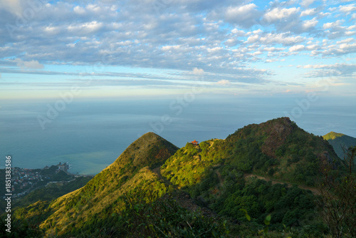 A wide view of a green mountain valley opening toward the sea under a blue sky, capturing peaceful nature, landscape depth, and outdoor travel scenery.