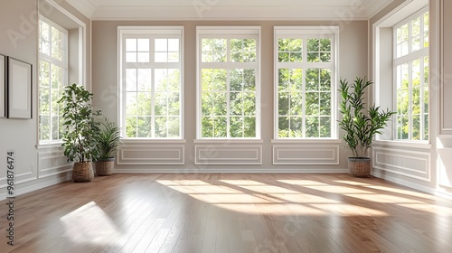 A wide-angle shot of an empty living room, featuring large windows that allow natural light to pour in, highlighting the neutral walls and polished hardwood floors.