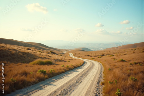 A winding dirt road through rolling hills under a soft blue sky
