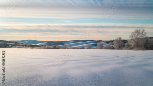 A winter landscape with trees and mountains in the distance on an endless plain covered with snow. A clear sky and white clouds