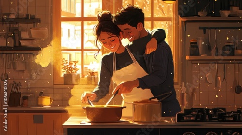 A woman and her partner cooking together in a warmly lit kitchen, she stirs a pot while he playfully hugs her from behind, both smiling and relaxed