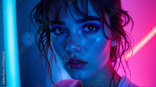 A Woman Bathed in Neon Light Captures Your Attention with Her Striking Features and Intense Gaze Under Electric Lights