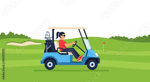 A woman driving a golf cart through a lush, vibrant green golf course on a sunny day capturing the essence of leisurely recreation