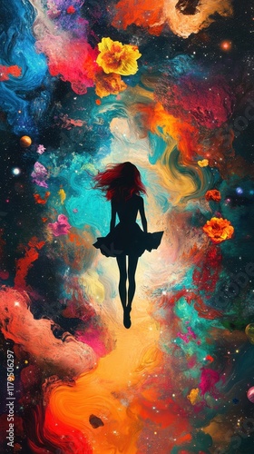 woman, girl, cosmic, nebula, space, star, planet, galaxy, universe, floating, red, hair, dress, silhouette, colourful, vibrant, abstract, art, painting, digital, artwork, fantasy, surreal, dreamlike, imagination, mystical, magical, aethereal, mysterious, flowing, swirling, colours, hue, shades, texture, energy, light, dark, depth, beauty, awe, wonder