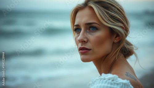A woman gazes thoughtfully toward the ocean waves at twilight, capturing a moment of reflection by the beach