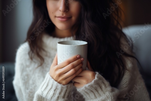 A woman holding a coffee cup in her hands. This image can be used to depict relaxation, morning routine, or enjoying a hot beverage.