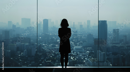 city landscape, woman, building, camera, black, dress, large, window, numerous, height, dense, urban, environment, sky, hazy, blue, overall, lighting, scene, position, density, high, floor, view, city