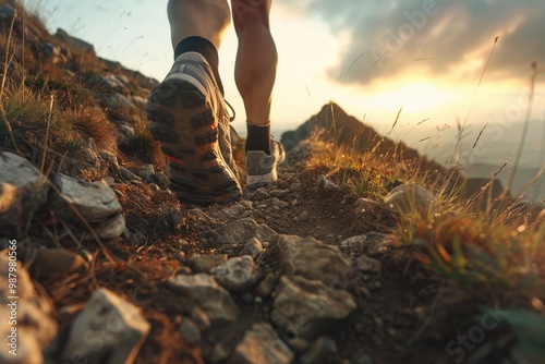 A woman is walking on a rocky mountain trail in red shoes, generative ai image