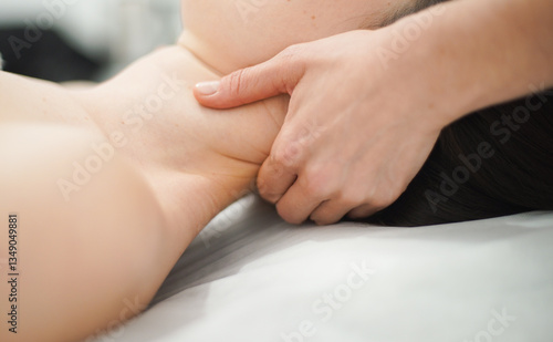 A woman lies on a massage table and the masseur's hands massage her neck. closeup. soft focus.
