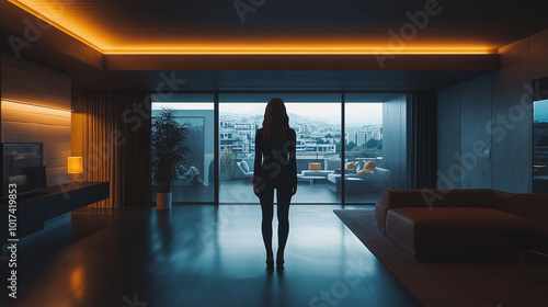 A woman standing alone in a modern, sleek apartment, showing independence and success in her personal life