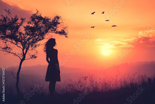 A woman standing on a hill, gazing at a vibrant sunset with birds flying overhead, symbolizing reflection, hope, and serenity.