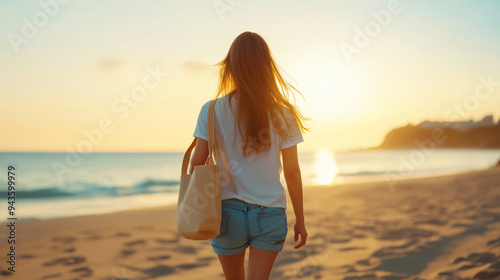 A woman walks along the beach at sunset carrying a tote bag, enjoying the serene atmosphere and gentle ocean breeze.