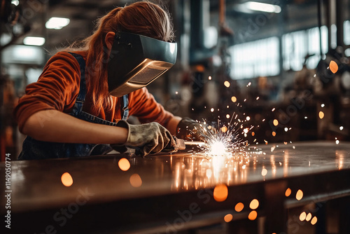 welder, woman, welding, spark, industrial, workshop, work, tool, machinery, metal, bright, professional, skilled, labor, safety, glove, engineering, craftsmanship, sharpened, steel, men at work, industry, construction, light, heat, hard work, glowing, equipment, mechanic, intense, artisan, fire, power, repair, safety-gear, focused, workplace, engineer, industrial tool, factory