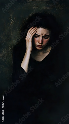 woman, migraine, sitting, dark, room, hand, forehead, eye, closed, face, hair, person, people, sad, black, head, serious, looking, fashion, model, 1, photogenic, boy, beauty, guy, expression, beard