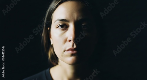 woman, portrait, serious, expression, dark, room, lighting, shadow, face, eye, gaze, direct, camera, photo, model, adult, one person, closeup, monochrome, mysterious, moody, intense, emotion, feeling, psychology, human, female, caucasian, brown hair, black shirt, simplicity, minimalism, artistic, creative, visual, art, culture, depth, contrast