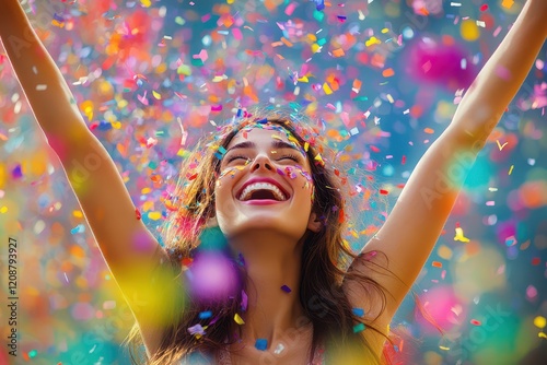 A woman with her arms raised in celebration surrounded by a burst of colorful confetti