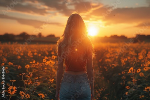 A woman with long hair stands in a vibrant sunflower field during a breathtaking sunset, capturing a beautiful blend of nature and serenity in the golden hour.
