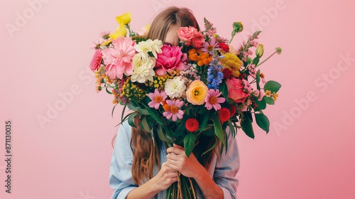A woman with messy hair is holding a large, colorful bouquet of wildflowers, completely covering her face. The background is a soft pastel blue.