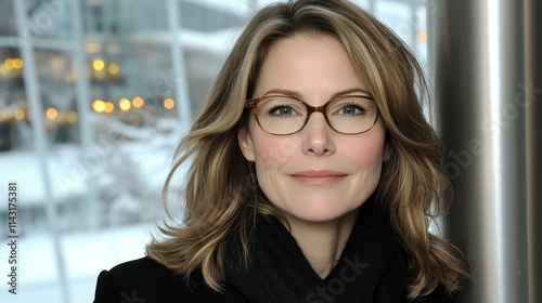 A woman with stylish glasses and wavy hair smiles warmly while standing indoors. The modern architecture around her is highlighted by soft winter lighting and blurred background elements