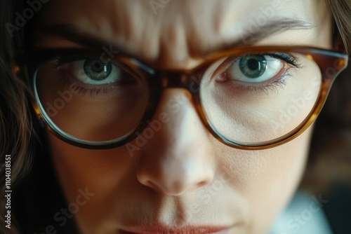 A woman with thick eyeglasses displays a serious expression, emphasizing her piercing green eyes. The close up captures her furrowed brow and focused demeanor, creating a striking emotional portrait.
