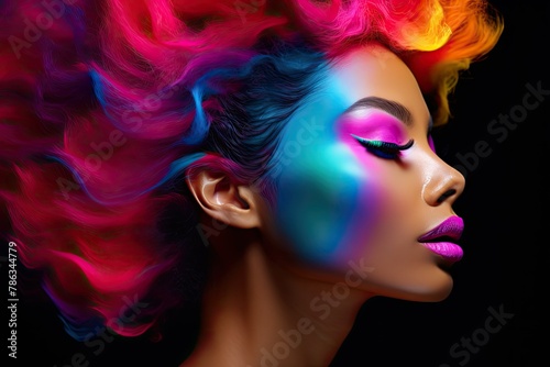 abstract, vibrant, concept, man, woman, artistic, realistic, imagination, lifestyle, colourful, romantic, surreal, professional, woman, hair, make-up, dye, striking, bold, appearance, unique, style, fashion, beauty, cosmetic, face paint, creativity, confidence, bright, expressive, individuality, trend, modern, coiffure, avant-garde, generative, ai