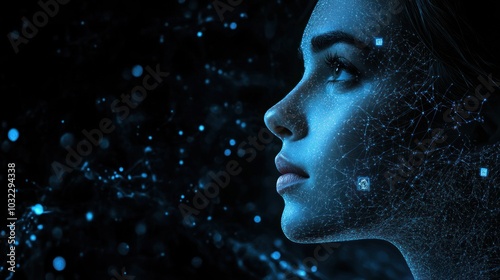 woman, face, profile, side, eye, nose, lip, mouth, skin, network, line, dot, glowing, blue, light, dark, background, abstract, technology, digital, futuristic, artificial, intelligence, concept, connection, datum, structure, pattern, mesh, web, grid, modern, graphic, design