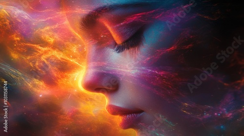 nebula, woman, face, abstract, art, cosmic, colourful, galaxy, space, star, dream, mystical, fantasy, surreal, digital artwork, futuristic, imagination, aethereal, energy, spiritual, light, darkness, vibrant, colours, glow, aura, swirl, movement, universe, hallucinogen, dreamlike, mind, consciousness, perception