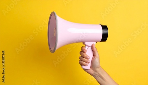 woman, hand, megaphone, pink, yellow, background, isolated, holding, creative, communication, loud, announcement, female, voice, expression, object, speaker, protest, empowerment, bold, colourful, attention, message, loudspeaker, signal, advertise, call, shout, activism, feminism, vibrant, icon, loudness, sound, energy, power, speaking, handhold, bright, concept, modern, design, tool, social, vocal, speech, broadcast, symbol