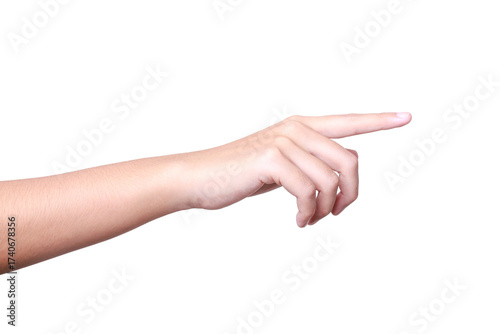 A woman's hand with an extended index finger, as if pressing something isolated on white background with clipping path.index finger reaching t touch, tap, click.