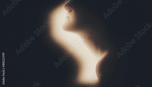 A woman's profile silhouette, illuminated by bright light, creating a contrast between dark and light areas. The background is dark, highlighting the illuminated part of the face.