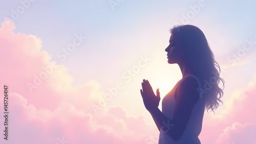 prayer, silhouette, woman, worship, watercolor, sky, pastel, spiritual, devotion, minimalist, serene, peaceful, faith, meditation, digital artwork, hd, wallpaper, background, elegant, reverend, divine, holy, sacred, contemplative, emotional, uplifting, calm, artistic, inspirational, religious, heavenly, symbolic, powerful, aethereal, beautiful, harmony, stillness, grace, profound, delicate, reverie, calmness, introspective