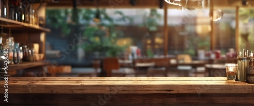 A wooden bar counter with bottles and glasses on it, set against a blurred background of a restaurant or bar setting with a large window and greenery outside.