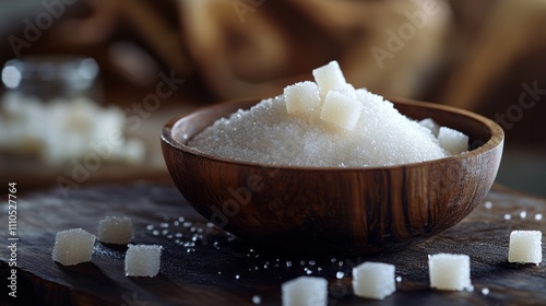 A wooden bowl filled with granulated sugar sits on a rustic wooden table, surrounded by small sugar cubes, creating a warm and inviting kitchen atmosphere