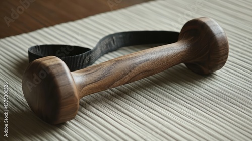 A wooden massage roller and stretching strap placed on a therapy mat, representing deep tissue massage and mobility training.