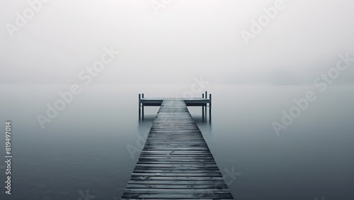 A wooden pier on a tranquil lake shrouded in mist