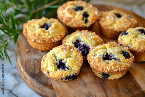 A wooden platter displays freshly baked blueberry muffins, garnished with sugar.
