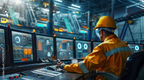 A worker in a yellow jumpsuit and safety helmet sits at a control panel in a factory, monitoring computer screens.