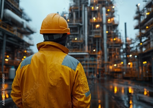 A worker in a yellow raincoat and hard hat stands in a wet, illuminated industrial plant during a rainstorm, representing safety, resilience, and industrial work environments