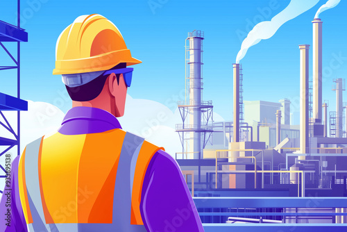 A worker in an industrial setting, wearing safety gear and looking over the construction of a factory or plant. Vector illustration with a flat design style, simple shapes