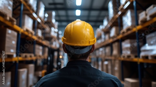 A worker wearing a yellow safety helmet stands in a warehouse, surrounded by shelves stacked with boxes, emphasizing the importance of safety and organization in logistics.