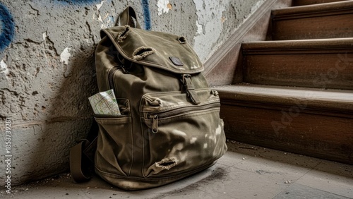 A worn and weathered backpack leans against a concrete wall beside a wooden staircase in an abandoned building.