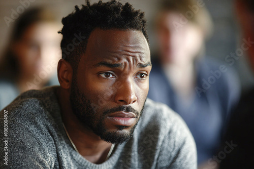 A worried african american man expressing vulnerability at group therapy, perfect lighting balancing privacy and authenticity.