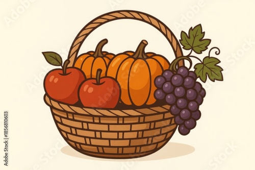A woven basket filled with three orange pumpkins, two red apples, and a bunch of purple grapes. The background is a soft cream color.