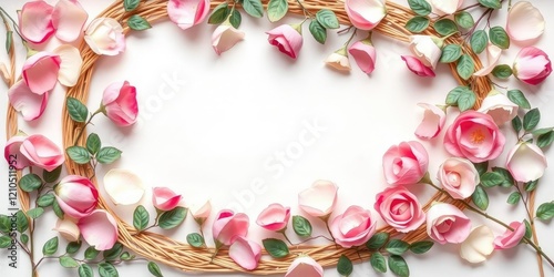 A woven frame of rose petals and leaves in soft pastel shades adds a touch of whimsy to a white paper background, romantic atmosphere, botanical framing, bohemian style