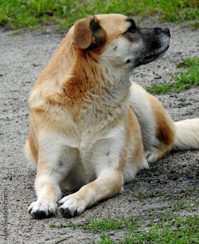a yawning dog resting by the main road in the church lipowiec village in mazovia, poland