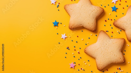 A yellow background with three cookies and a lot of stars